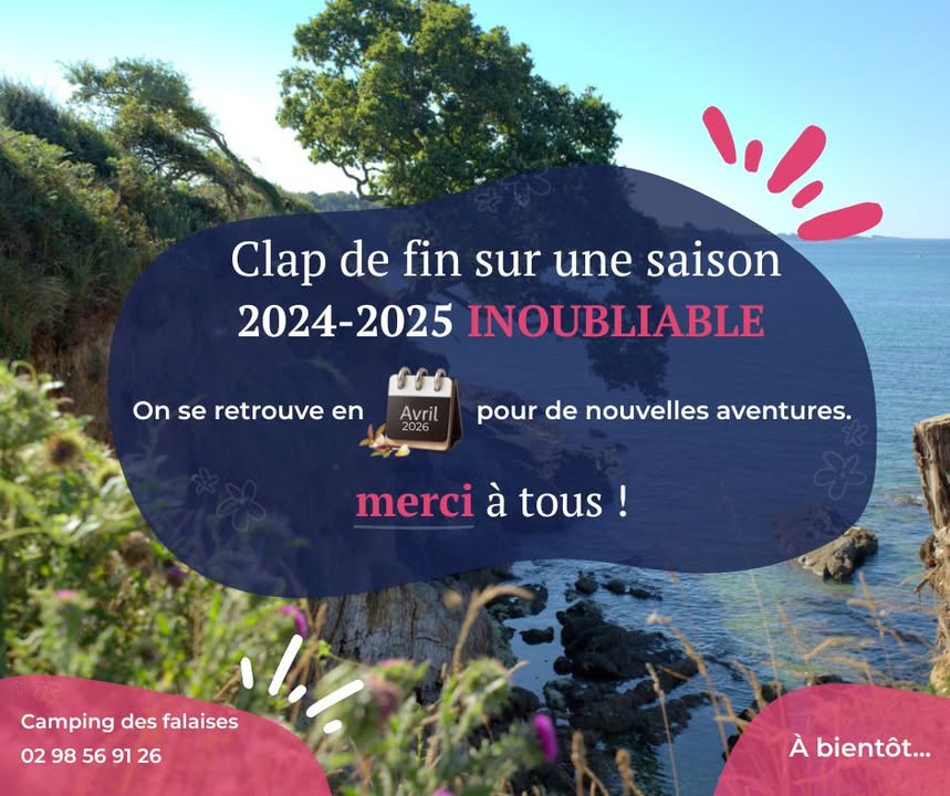 ⛺ Fin de saison au Camping Les Falaises ! ⛺ Et voilà, notre belle saison 2025 touche à sa fin… Le camping fermera ses portes à la fin du mois de septembre 🍂 après des mois de rencontres, de rires et de moments partagés. ✨ Merci infiniment à toutes et à tous pour votre confiance et vos sourires. C’est grâce à vous que le Camping Les Falaises demeure un lieu aussi chaleureux et convivial. 👉 Ne vous inquiétez pas : nous vous retrouverons dès avril 2026 pour une nouvelle saison empreinte de nature, de détente et de convivialité. En attendant, suivez-nous pour rester informés de nos nouveautés et préparer vos prochaines vacances. Toute l’équipe vous souhaite un bel automne 🍁 et un hiver en douceur ❄️. #CampingLesFalaises #FinDeSaison #VacancesNature #OnSeRetrouveEnAvril Source