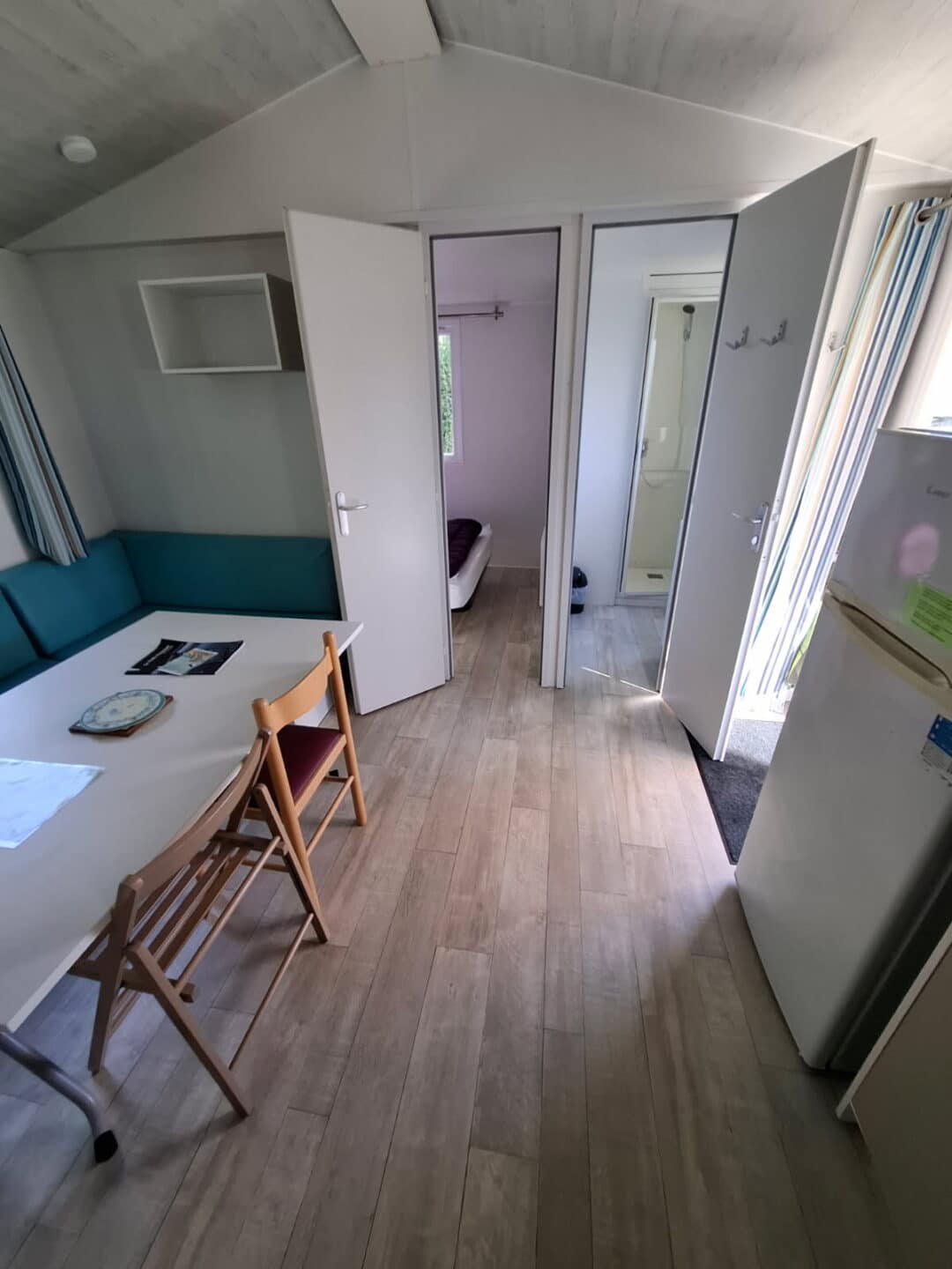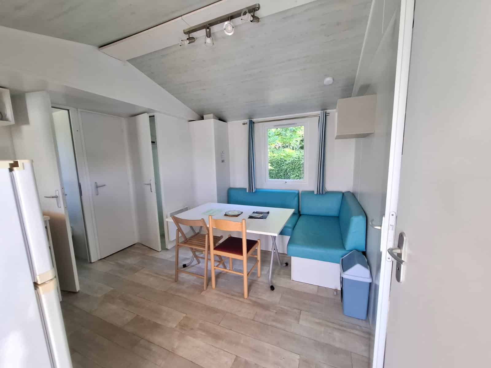 Le salon comprend un canapé, une table et des chaises. La salle d’eau offre une douche et un lavabo, avec des toilettes séparées.